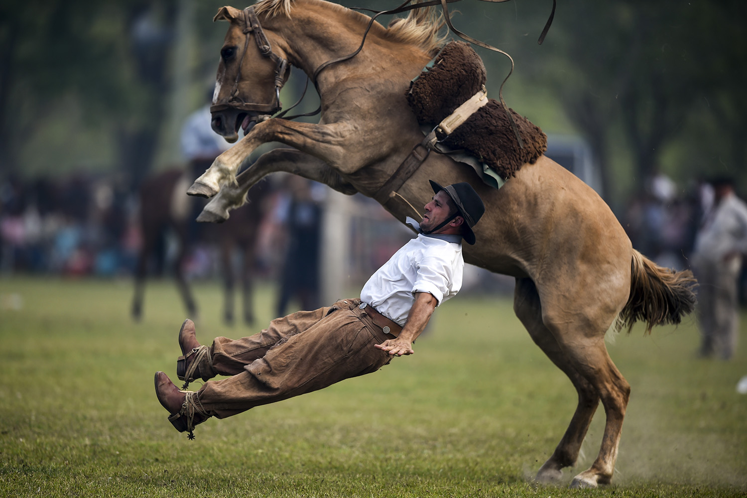 Common rodeo events include bull riding, bronco riding, cattle roping and steer wrestling. Clowns perform to bring light relief to the proceedings.