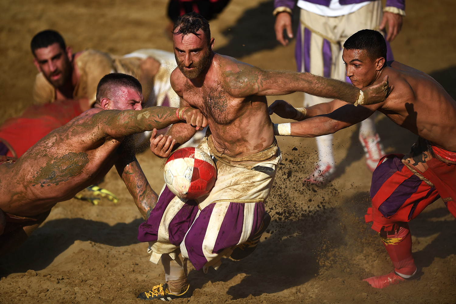The blue, red, white and green teams from the city's four quarters face off before the two overall winners go on to the final. The teams of 27 players compete on the number of goals scored and almost ail punches are allowed. The brutal and bloody tradition began in the 16th century. By the 18th century it had been largely forgotten, before being revived in the 1930s.