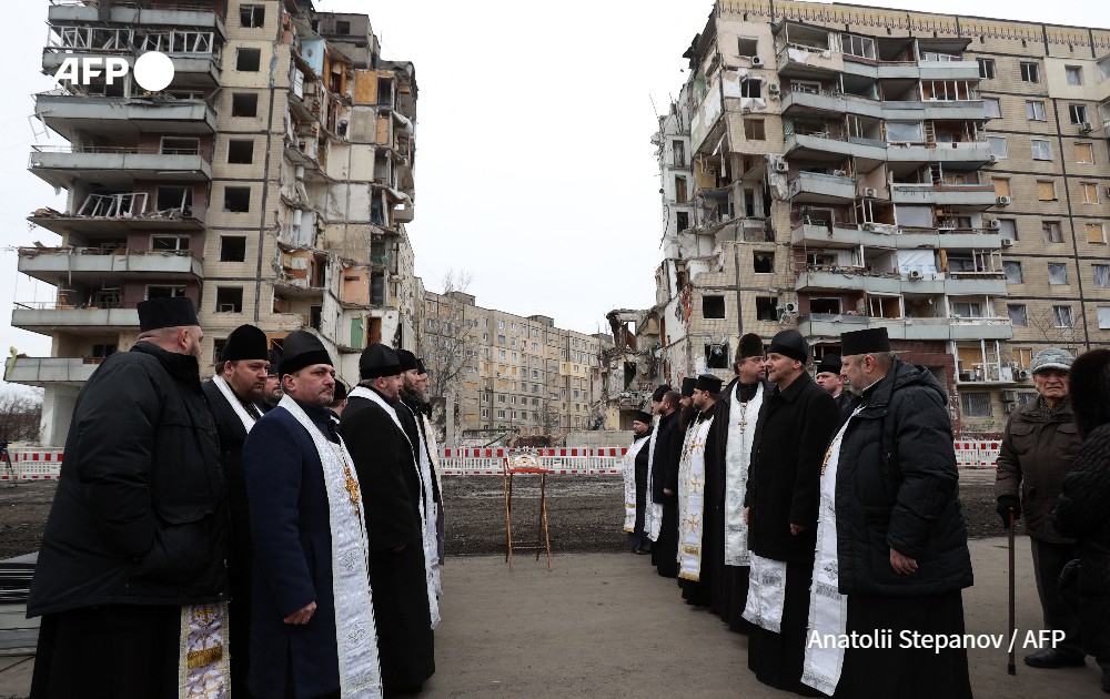 Orthodox priests hold a religious service in front of the residential building in the Ukrainian city of Dnipro on January 22, 2023, destroyed as a result of a missile strike on January 14. The toll has climbed to 45 killed, making the strike one of the deadliest attacks since Russia invaded Ukraine nearly 11 months ago, but the Kremlin denies responsibility.